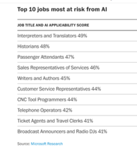 Microsoft conducted a recent study, “Working with AI: Measuring the Occupation Implication of Generative AI,” which identified future jobs under threat. Just behind interpreters and translators were historians.