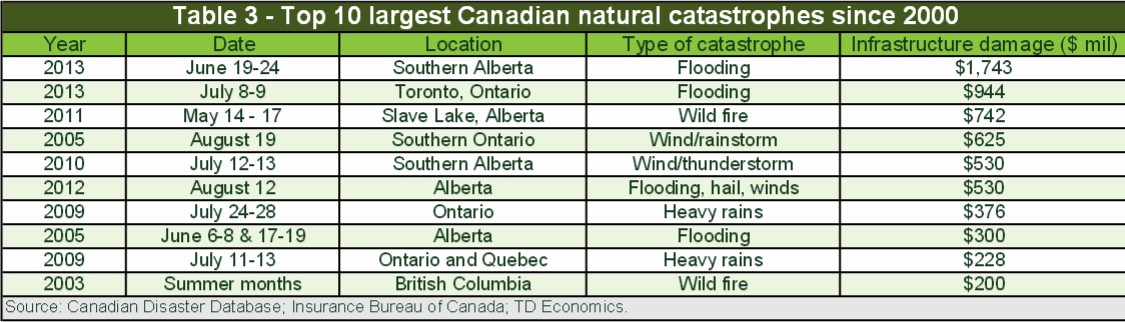 April 18, 2014 – The Toronto-Dominion Bank, currently vying for the number one position in Canada, and a growing player in the United States, issued on April 14 a special report, Natural Catastrophes: A Canadian Economic Perspective. The document doesn’t directly talk about climate change but it is inferred throughout. Instead it talks about “weather conditions” and their socioeconomic impact.
