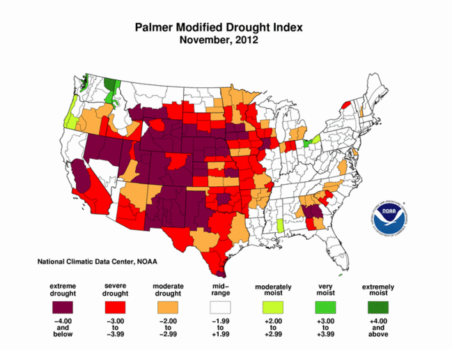 Currently, 52.4% of the contiguous United States is declared to be experiencing moderate to exceptional drought conditions. Those areas of the country experience the most extreme drought increased 8% from October 2012, with November ranked as the 20th warmest and 8th driest on record based on data collected since 1895.