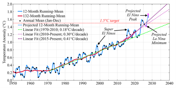 Today, Hansen and his colleagues, Pushker Kharecha, Dylan Morgan and Jasen Vest, published their latest findings and predictions, noting that we are heading for another El Niño, three years after the last one, describing it as a faster cycling than normal. They predict, as a result, a new record global high mean temperature in 2026 and a higher one in 2027. They believe the trend points to a 2°C (3.6°F) mean temperature rise by the 2030s, faster than previous mid-century predictions. The following graph plots global surface temperature data from 1950 to the present, showing how El Niño highs recently have surpassed the Paris Climate Agreement lower target of 1.5°C (2.7°F).