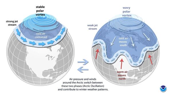 In Canada, where I live, El Niños typically cause warmer, drier winters while La Niñas cause cooler temperatures, rain and more snow for the eastern half of the country. The recent polar vortex that settled over much of Eastern Canada and the U.S. vausing iguanas in Florida to fall out of trees, has its roots in the current La Niña. A cooler Eastern Pacific Ocean destabilizes southern air masses, which makes winter Arctic air creep south and causes dramatic oscillations in the Jet Stream. The two pictures below show the stable El Niño phase on the left, and the pattern that comes during La Niñas on the right.