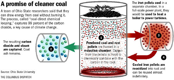 Ohio State is also experimenting with a variation on this chemical looping process. This one involves gasifying the coal to create syngas, a combination of carbon monoxide (CO) and hydrogen. Iron oxide (rust) is introduced and reacts with the syngas to release oxygen and wustite. The oxygen combines with the CO to form CO2, and the hydrogen to form steam. The CO2 is streamed, captured and sequestered. The wustite then gets exposed to air and forms iron oxide (rust) and heat which then can be used to drive steam turbines. If the iron is exposed to steam it can separate out the hydrogen in the vapour and capture it as a fuel for fuel cells.