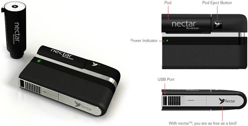 The Nectar uses a solid oxide thin film fuel cell (SOFC) to generate a +5 volt charge to any device plugged into it. It can power a wide range of electronic devices through its USB 2.0-compatible port. Each Power Pod stores 55,000 MW-hours of energy in a single cartridge.
