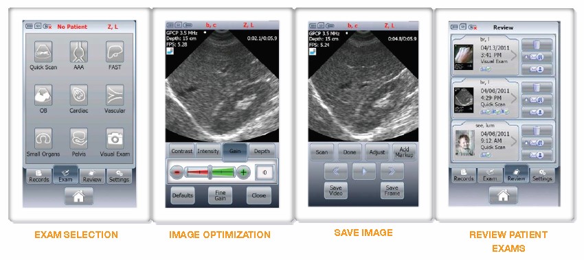 The device allows the operator to select from 9 different scan types including a general quick scan (see the panel image on the left below). Images can be adjusted to increase contrast. Operators can make notations and measurements, and personal patient information can be entered using the touch screen keyboard. The technology is very similar to ultrasound equipment used in hospital settings so the learning curve for a field operator is quick.